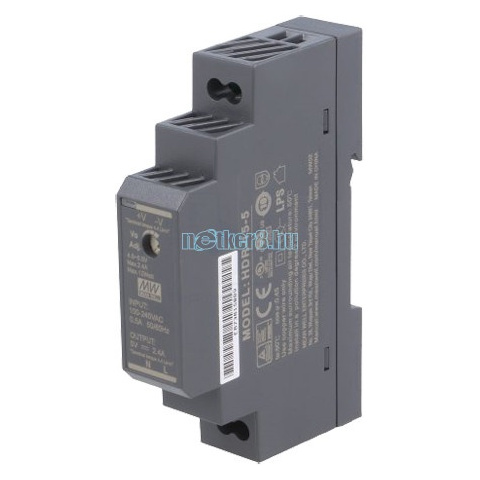 DIN sínre pattintható tápegység, Vin: 85-264VAC 120-370VDC, Vout: 5 VDC (0-2,4A), P: 12W Mean Well HDR-15-5