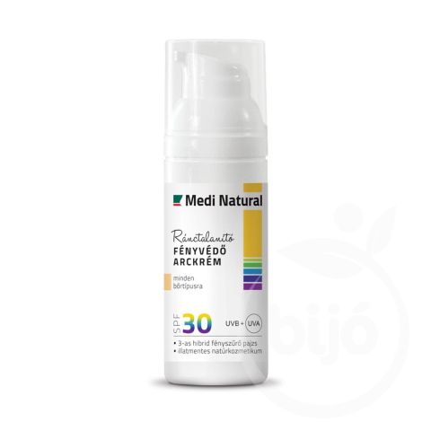 Medinatural spf30 ránctalanító fényvédő arckrém 50 ml Könnyen eloszlik és azonnal beleolvad a bőrbe, zsíros érzet és fehér réteg nélkül. Mindennapos használattal a fényvédő arckrém segít a ráncok elleni harcban, halványítja a mimikai ráncokat és a szar