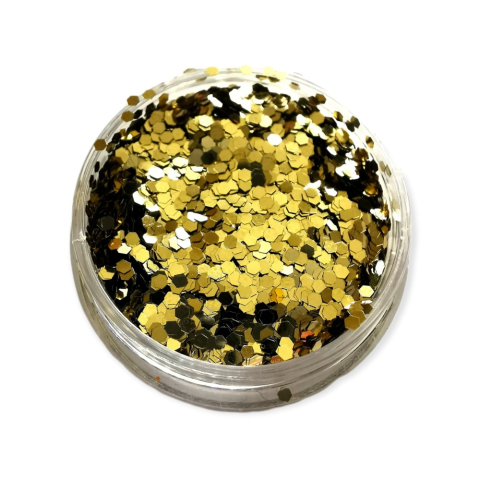 Arany színű nagyszemcsés csillámok zárható tégelyben. Előszeretettel használják felnőttek és tinik egyaránt. Alkalmazható fesztivál sminkhez, arc és testfestéshez kiegészítőként, haj díszítésként. Anyaga 100% polietilén-tereftalát, biztonságosan használha
