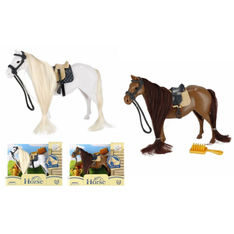 A nyerges lónak hosszú sörénye és farka van, és két színben kapható: barna és fehér. A nyereg és a heveder levehető.