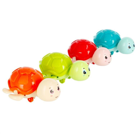 A színes teknős kiváló minőségű műanyagból készült. A teknős kerekeken van és lendkeréken ül.