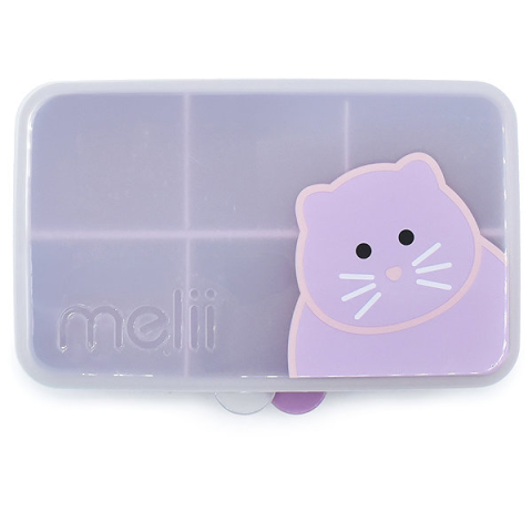 Uzsonnás doboz - osztott, gyerek, űrtartalma 0,684 l, mérete 5,3 × 18,3 × 12,3 cm (Ma×Sz×Mé), ráhelyezhető fedél, alkalmas mosogatógépbe, anyaga szilikon és polipropilén, lila és áttetsző kivitel, állat és mese motívum A hasznos Melii uzsonnás doboz a ráhelyezhető fedélnek köszönhetően könnyen zárható és nyitható, és 0,684 l térfogattal rendelkezik. A tér változatos kihasználását a rögzített válaszfal biztosítja, am