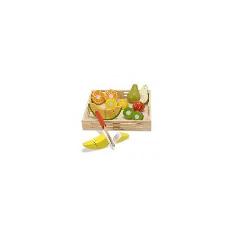 Ez a minőségi fából készült ételjáték készlet tartalmaz egy fából készült játékkést, hét gyümölcsgerezded, ami összesen 17 részre darabolható. A gyümölcsdarabokat öntapadó lapok tartják össze, így amikor gyermeked kettévágja, igazán élethű hangot ad k