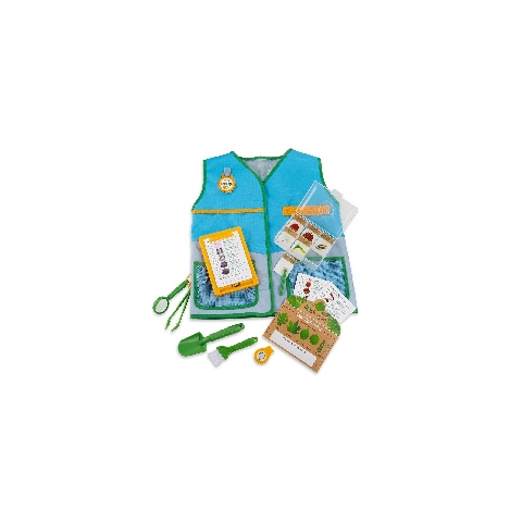 Melissa és Doug természettudós szett, amelyhez tartozik egy gépben mosható mellény és a szükséges gyűjtőeszközök, köztük egy lapát, nagyító, csipesz, kefe, mintatartó, valamint egyéb hasznos apróságok, például tevékenységkártyák.