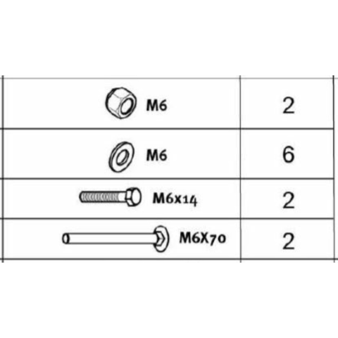 M6 csavar készlet, 2 db. anya, 6 db. alátét, 2 db. 18 mm-es csavar, 2 db. 70 mm-es csavar.Menabo cikkszám: 700013300000{Kiszerelés:szett}