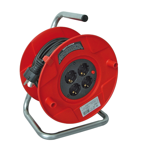 Műanyag kábeldob 4 db csatlakozóaljzattal, beltéri használatra. A dobtest rugalmas műanyagból, a váz stabil acélcsőből, a kábel köpenye rugalmas műanyagból készült. A 25 m-es műanyag vezeték típusa H05 VV-F 3G1,5. A kábel biztonsági rendszerrel túlhevülés ellen védett.
