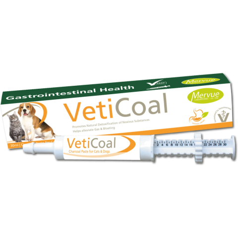 Mervue VetiCoal magas koncentrációjú, 50% aktív szén tartalmú étrendkiegészítő paszta a káros anyagok megkötésére a béltraktusban, megakadályozva ezek felszívódását. Adszorbens és abszorbens hatásának köszönhetően támogatja a toxinok természetes méregtelenítését, védi a bélnyálkahártyát, enyhíti a puffadást és a gázképződést. Tengeri hínár tartalmának köszönhetően pótolja a hasmenéssel járó elektrolitveszteséget. Kutyák és macskák