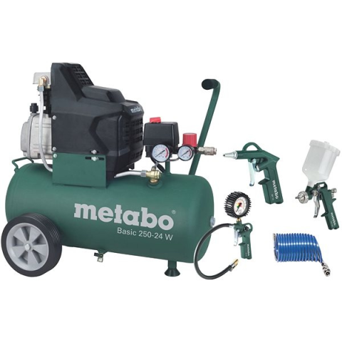Kompresszor - 230 V feszültség, légtartály űrtartalma 24 l, max. üzemi nyomás 8 bar, 1500 W teljesítmény, max. áramlás 1,83 l/m, zajszint 97 dB, olajos, analóg kijelzés, használt mértékegységek Bar, mérete 62 × 34 × 58 cm (Ma×Sz×Mé), tömege 27 kg, fújópisztoly, szórópisztoly és sűrítő pisztoly a csomag része A Metabo Basic 250-24 W kompresszor magas és különösen konzisztens nyomásával barkácsolók és pörgő műhelyek számára egyaránt alkalmas. A 200 l
