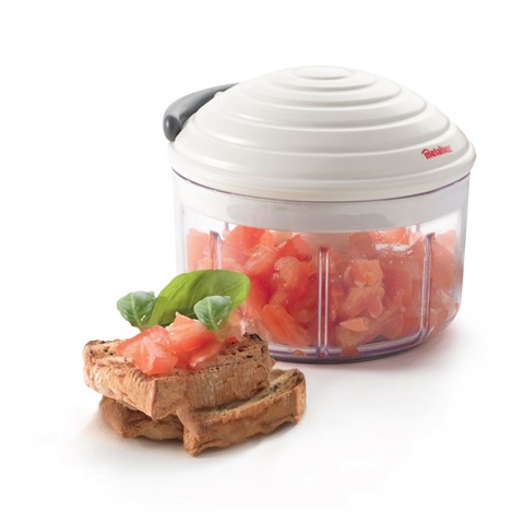 Roto Mac univerzális szeletelő. Zöldségeket, gyümölcsöket apríthatunk a segítségével. Vágjuk fel az aktuális ételt és tegyük az aprítóba, majd a zsinórt huzogatva aprítsuk fel azt.