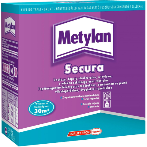A Metylan Secura üvegfátyol-, trend- és vario vlies, sima és domborított vliestapéta, selyemtapéta, valamint átfesthető pl. fűrészporos- és struktúra tapéta ragasztására ajánlott tapétaragasztó - nedvszívó felületre. Gyorsan és csomómentesen oldódik, 15 perc után felhasználásra kész. Alkalmazása ideális erősen nedvszívó felületeken (alapozásra is), valamint nedves helyiségekben (pl. konyha, vizesblokk). Hosszú nyitott idővel rendelkezik, tapétázó gépekh