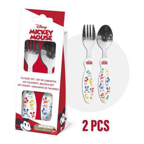 Disney Mickey fém evőeszköz készlet - 2 darabos Fém kanálból és villából álló készlet, amellyel gyermeke a lekerekített formájuknak köszönhetően szórakoztató és biztonságos módon tanulhatja meg a felnőtt evőeszközök használatát étkezés közben. Anyaga: i