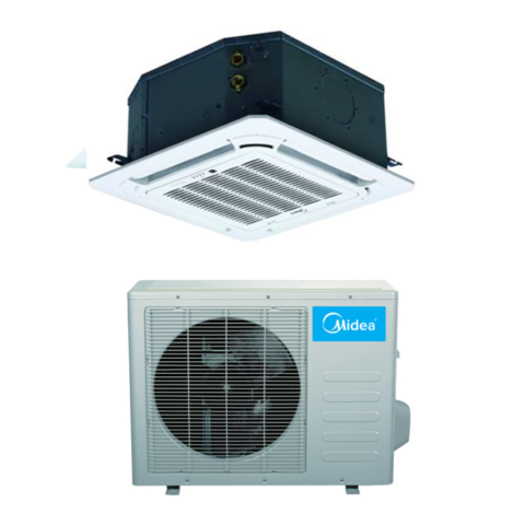 Midea MCA3-12HRFN8-SP kazettás split klíma 3,5kW Professzionális mennyezeti kazettás klíma 35-45 m²-es helyiségek klimatizálására. R32 hűtőközeggel, 360°-os légáram elosztással és beépített cseppvízszivattyúval. Ideális irodák, üzletek és nagyobb lakóter