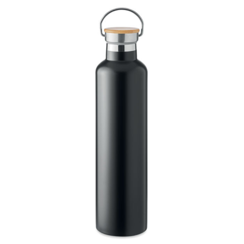 Duplafalú rozsdamentes acél termosz fém fogantyús bambusz kupakkal. Űrtartalom: 1 l. A bambusz természetes anyag, színében, mintázatában és méretében esetenként eltérő lehet.