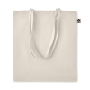 Organikus pamut bevásárlótáska hosszú fülekkel. 140 g vastag anyag. A káros anyagok textilipari felhasználására vonatkozó tanúsított szabvány szerint készült.