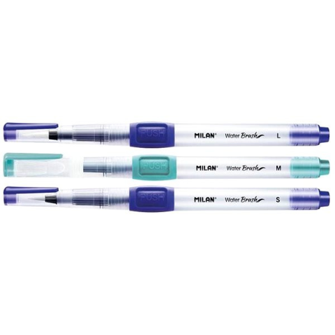 Ecset - ecsetek vízfestékhez, finom hegyű, 8 ml-es víztartállyal, szintetikus nejlonszálból készült, a készlet két 3 mm és 5 mm átmérőjű kerek ecsetet és egy 7,5 mm széles lapos ecsetet tartalmaz, puha, teljesen műanyag test, könnyen mosható, alkalmas akvarellceruzával való munkához, akvarellrajzoláshoz vagy tusrajzoláshoz