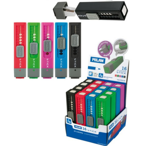 Radír és betétes ceruzahegyező kombinációja. STICK kivitel. Téglalap alakú hosszú radír. A ceruzahegyező éles és ellenálló acél pengével rendelkezik, amely ideálissá teszi minden típusú ceruzához. Biztonsági pengerendszer, amely megakadályozza, hogy a penge leváljon a ceruzahegyező testéről.