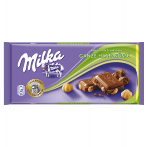 Milka tejcsoki tábla egész szem mogyoróval. A tejcsokoládéban a kakaó szárazanyag min. 30%.