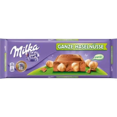 Milka tejcsoki tábla egész szem mogyoróval. A tejcsokoládéban a kakaó szárazanyag min. 30%.