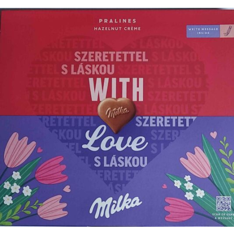 Milka I Love Milka alpesi tejcsokoládé praliné mogyorókrém töltelékkel. A tejcsokoládéban a kakaó szárazanyag min. 30%.