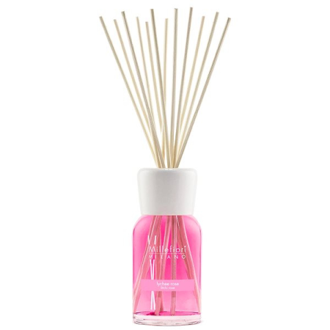 Pálcás aroma diffúzor - virágos és gyümölcsös illat akár 180 nap hatással, üveg edény, 12 pálca, pálcák hossza 35 cm, űrtartalma 500 ml A MILLEFIORI Milano Lychee Rose egy elegáns aroma diffúzor illatpálcikákkal, amely a béke és harmónia oázisává varázsolja az otthonod. A virágos illat a timori bors és az érett licsi friss gyümölcsös