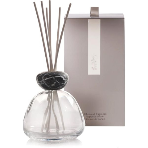 Pálcás aroma diffúzor - üveg edény, 5 pálca, pálcák hossza 25 cm A MILLEFIORI MILANO Marble Glass Clear Black Lid (újratöltés nélkül) alapvető előnyeiA MILLEFIORI MILANO illatpálcikák ideálisak bármilyen helyiség illatosításáraAz illat fokozatosan szabadul fel a pá