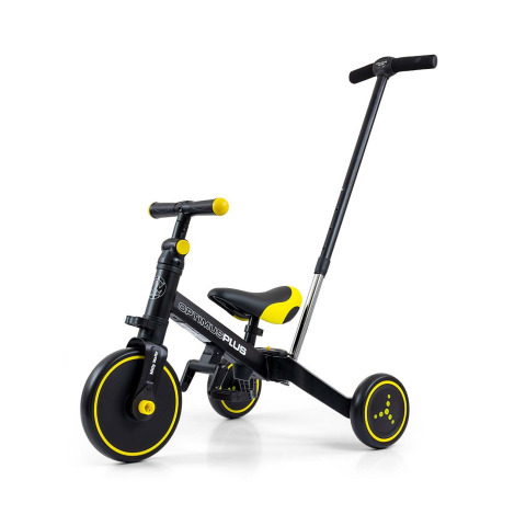 Univerzális gyermek pedálos tricikli Milly Mally Optimus 4az1-ben. Stabil konstrukciójának köszönhetően a legnagyobb biztonságot nyújtja a gyermekeknek. Ennek a triciklinek a legnagyobb előnye a változékonysága. A habkerekek tökéletesen vezetés közben biz