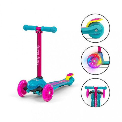 Super Stílusos gyerek roller Milly Mally Scooter Zapp. Ideális sétákhoz és nagyszerű szórakozást nyújt a gyerekek számára. A fémszerkezet garantálja a termék tartósságát. Minőségi anyagokból készült. A kormánya nem forgatható, hanem jobbra - balra dönthet