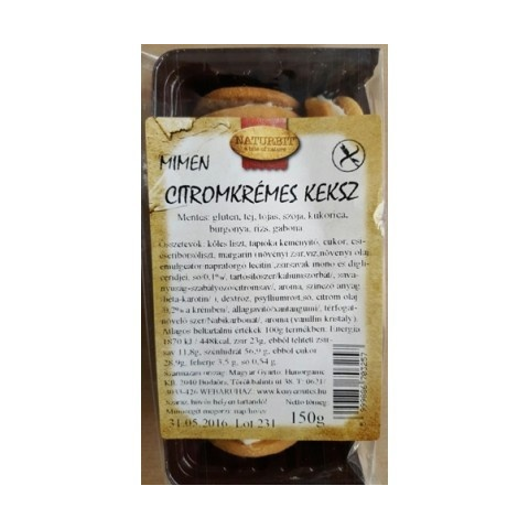 MiMen – citromkrémmel töltött minden mentes keksz. Összetevők: gluténmentes lisztkeverék /köles liszt, tápióka keményítő, csicseriborsó liszt, dextróz, psyllium rost, étkezési só, térfogatnövelő szer (Na-bikarbonát), stabilizátor (xantan gumi)/, margari