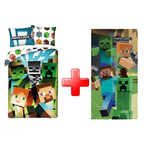 Minecraft ágyneműhuzat és törölköző szett. Ágynemű anyaga:100% pamut. Mérete: 140×200cm, 70×90 cm Kitűnő színtartó anyagból készül. Minősége: I osztályú. Törölköző anyaga: 100% pamut Mérete: 70x140 cm