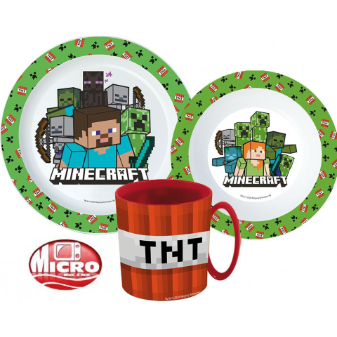 Minecraft Étkészlet, micro műanyag szett -BPA Mentes -Származási ország: Spanyolország -A termék környezetbarát, újrahasznosítható anyagból készült a Föld védelmében. Csomagolás nélkül! A készlet tartalma: 1 db mélytálka (Mikrózható műanyag) 1 db lapos
