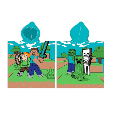 Minőségi pamut gyerek poncsó a Minecraft számítógépes játék motívumával, amit különösen értékelni fog a strandon vagy akár otthon egy fürdőzés után. A poncsó fürdőlepedőként vagy kapucnis köntösként is használható.
