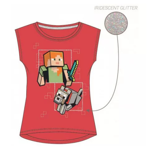 Minecraft gyerek póló, felső Glitter print! Anyaga: 100 % pamut Piros anyaga: 95% pamut + 5% viszkóz Méret: 5 év (110 cm)