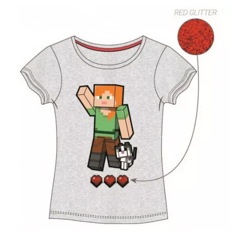 Minecraft gyerek póló, felső Glitter print! Anyaga: 100 % pamut Szürke anyaga: 95% pamut + 5% viszkóz Méret: 5 év (110 cm)