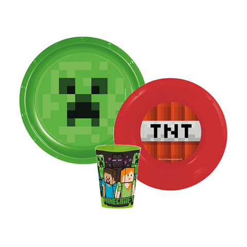 Minecraft étkészlet, műanyag-BPA Mentes-Származási ország: Spanyolország-A termék környezetbarát, újrahasznosítható anyagból készült a Föld védelmében.Csomagolás nélkül!Nem mikrózható!A szett tartalma:1 db mélytálka1 db lapostányér1 db pohár 260 mlA termék anyaga: műanyag.