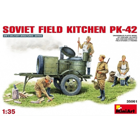 A szovjet KP-42 tábori konyha 1/35 méretarányú modell változata. Jellemzők: - 1:35 méretarány - Műanyag - Aprólékos kidolgozás - Festést, ragasztást igényel - 4 darab figura