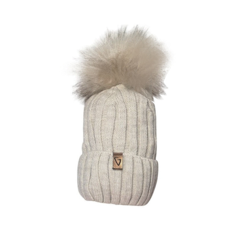 1 kép MiniM Gyerek sapka bojtos, téli kötött – Drapp, "G" Emblémával 52-54