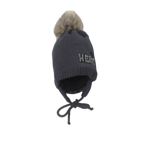 1 kép MiniM Gyerek sapka bojtos téli kötött - Szürke / "Hero" hímzéssel 48-50