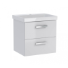 Mirano Vika mosdószekrény porcelán mosdóval magasfényű fehér front lapokkal és matt fehér oldalsó elemekkel. A készlet tartalmazza az 50 cm széles mosdószekrényt, Mirano VEA 50 cm széles kerámia mosdókagylót és a szifon készletet. 2 fiókos mosdószekrény,