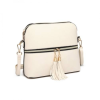 A táska külső oldalát két bojtos cipzár díszíti. A hátoldalán egy cipzárral zárható zseb található.