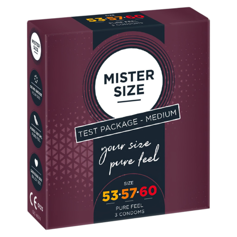 Mister Size óvszer Tesztcsomag - 3db A csomag tartalma: 1 darab Mister Size óvszer (53 mm szélesség, 10,5 cm pénisz kerülethez) 1 darab Mister Size óvszer (57 mm szélesség, 12,0 cm pénisz kerülethez) 1 darab Mister Size óvszer (60 mm szélesség, 14,5 c