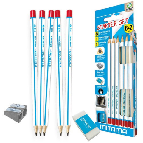 Mitama Grafitceruza Mitama, háromszögletű, radírral, 2 lyukú hegyezővel, 6db-os klt. ceruza termékleírás