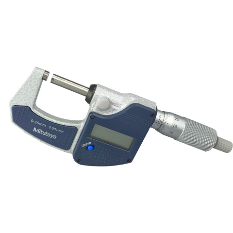 Kengyeles mikrométer, digitális, 0-25mm-ig//Mitutoyo felbontás: 0.001 mmhosszmérő Dob és hüvely szatén króm kivitelben: ø18 mmlaposság: 0.3 μm/0,000012”párhuzamosság: 2μm/0,00008”mérőlapok: keményfém, átlapoltmérőorsó: ø 6.35 mm, menetemelkedés 0.5 mmn