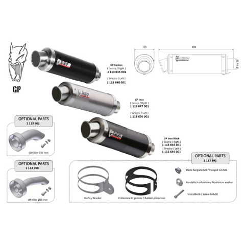A Mivv GP egy kompakt, versenyhangulatot idéző kipufogó. A hangtompító kerek kialakítású, szélesített végekkel, amely a sportos megjelenést hangsúlyozza. Kiemelkedő teljesítményét a versenycélú kipufogók fejlesztése során alkalmazott műszaki megoldások biztosítják.Kizárólag pályahasználatra, közúti forgalomban nem engedélyezett.A különböző elemek (kipufogó, DB killer, szerelőkészlet) külön vásárolhatók meg.