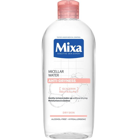 Micellás víz - száraz és érzékeny bőrre, arc és sminklemosásra egyaránt alkalmas, semleges pH 7, hidratáló glicerinnel A Mixa Anti-Dryness micellás víz a bőr kiszáradása ellen hat, és ideális az érzékeny és száraz bőr sminkeltávolításához. Gyengéden távolítja el a sminket az arcról és a szemekről egyetlen mozdulattal.