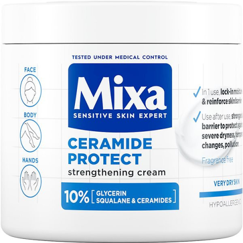 Testápoló krém - hidratáló, regeneráló és tápláló hatás, száraz bőrre ajánlott, alkalmas száraz bőrtípusra, ceramidos, hatóanyaga glicerin, űrtartalma 400 ml Nincs kitöltve a fénykép alternatív szövege!Ceramide Protect termékcsalád a nagyon száraz és érzékeny bőrreKényeztesd bőrödet a szükséges hidratálással a Mixa Ceramide Protect testápoló tejjel és krém