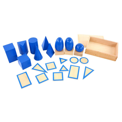 A játék segít, hogy a gyermekek megismerjék a környezetükben található egyszerű alakzatokat, geometriai formákat.A készlet tartalmaz egy tetővel rendelkező fadobozt, 10 db geometriai alakzatot és 8 db alapot.Alakzatok: kocka, téglatest, háromoldalú hasáb, kúp, szabályos négyoldalú gúla, háromoldalú gúla, henger, gömb, ovoid, ellipszoid.Méretük: kb. 6 x 6 x 10 cm.A testek fából készültek és kékre vannak festve.