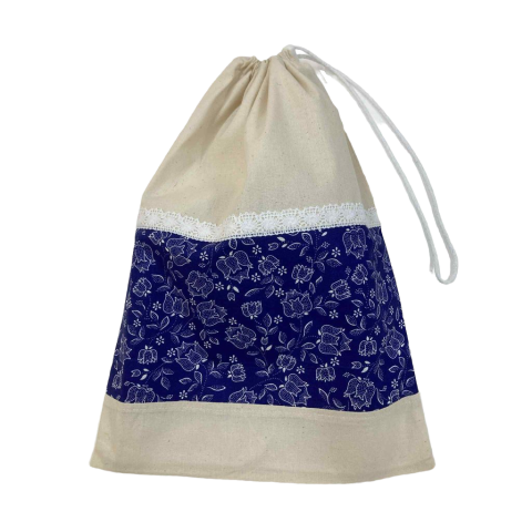 1 kép MK Bea Behúzós zsák – natúr pamut kék tulipán mintával, csipkével és PUL béléssel