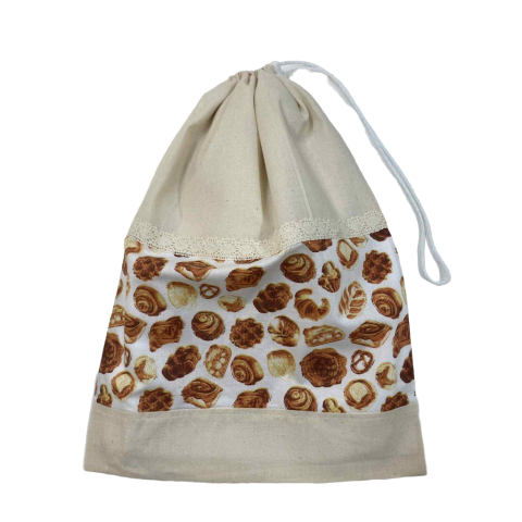 Ez a behúzós zsák igazi stílusos kiegészítője a konyhának, amely nemcsak praktikus, de fenntartható is. A pamutvászon külső rész csipkebetéttel és péksütemény mintával díszített, belül pedig PUL bélés gondoskodik arról, hogy a pékáruk hosszabb ideig frissek maradjanak. A zsinóros záródás egyszerű és kényelmes használatot biztosít. Könnyen tisztítható, újra és újra használható, így kiváló alternatívát kínál az egyszer használatos műanyag tasako