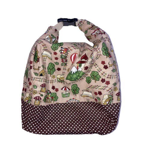 Ez a mesefalvas mintás pamut füles zsák barna pöttyös aljjal igazán játékos és vidám kiegészítő. PUL bélésének köszönhetően frissen tartja a kenyér és a péksütemények állagát, miközben higiénikus és könnyen tisztítható. Csatos zárása biztonságos és praktikus, strapabíró anyaga pedig hosszú távú használatot garantál. A mosható textiltasak nemcsak kenyértárolásra, hanem uzsonnás- vagy tárolózsákként is remek választás. Környezetbarát, újraha