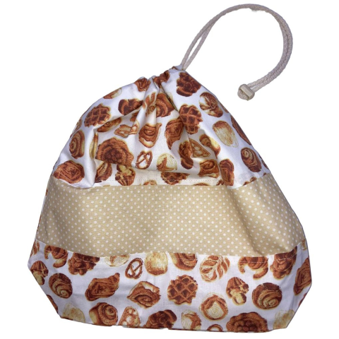 Ez a péksütemény mintás, bézs pöttyös betéttel díszített kis cipószsák hangulatos és praktikus választás a mindennapokra. Ideális kisebb cipók, kiflik és zsemlék tárolására. Strapabíró pamut anyagának köszönhetően mosható és újrahasználható, így környezetbarát alternatívát nyújt az egyszer használatos zacskók helyett. A behúzózárnak köszönhetően könnyen kezelhető, miközben frissen tartja a pékárut.